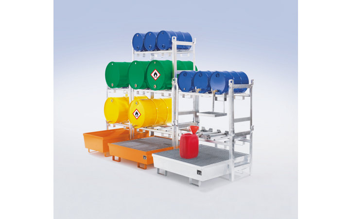 - Yatay 200 litrelik varillerin ve küçük kapların iç alanda emniyetli, kombine bir şekilde depolanması ve doldurulması için