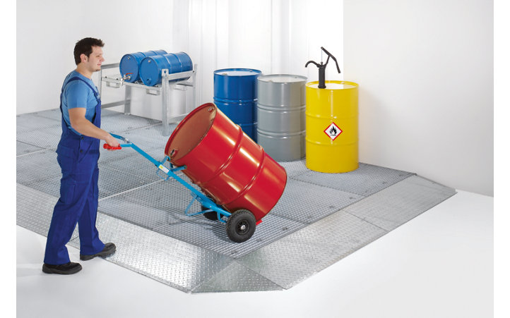 - Varil taşıyıcı, forklift ve istifleyiciyle birlikte 78 mm'lik oldukça alçak yapı yüksekliği sayesinde kolayca hareket ettirilebilir ve üzerine çıkılabilir